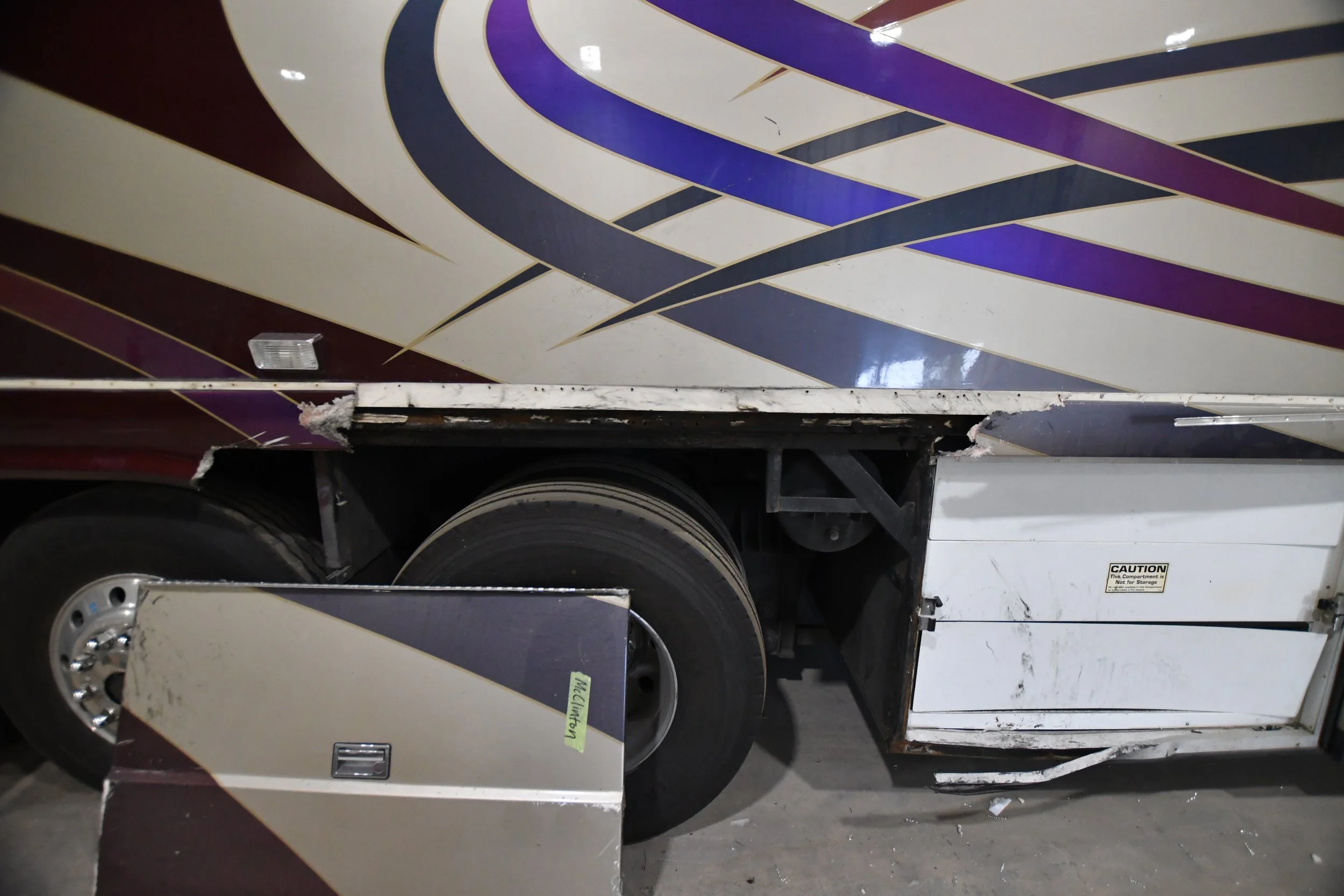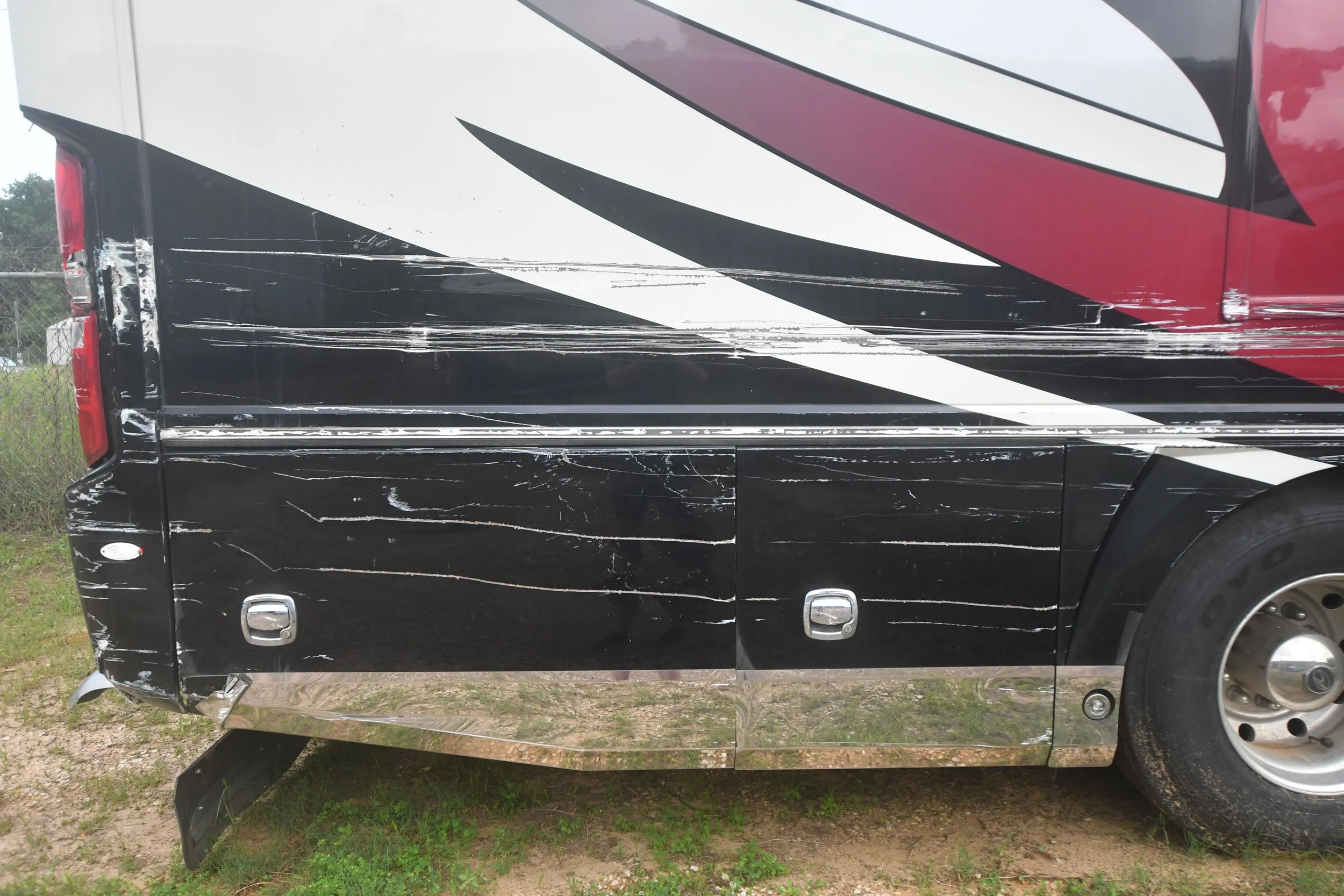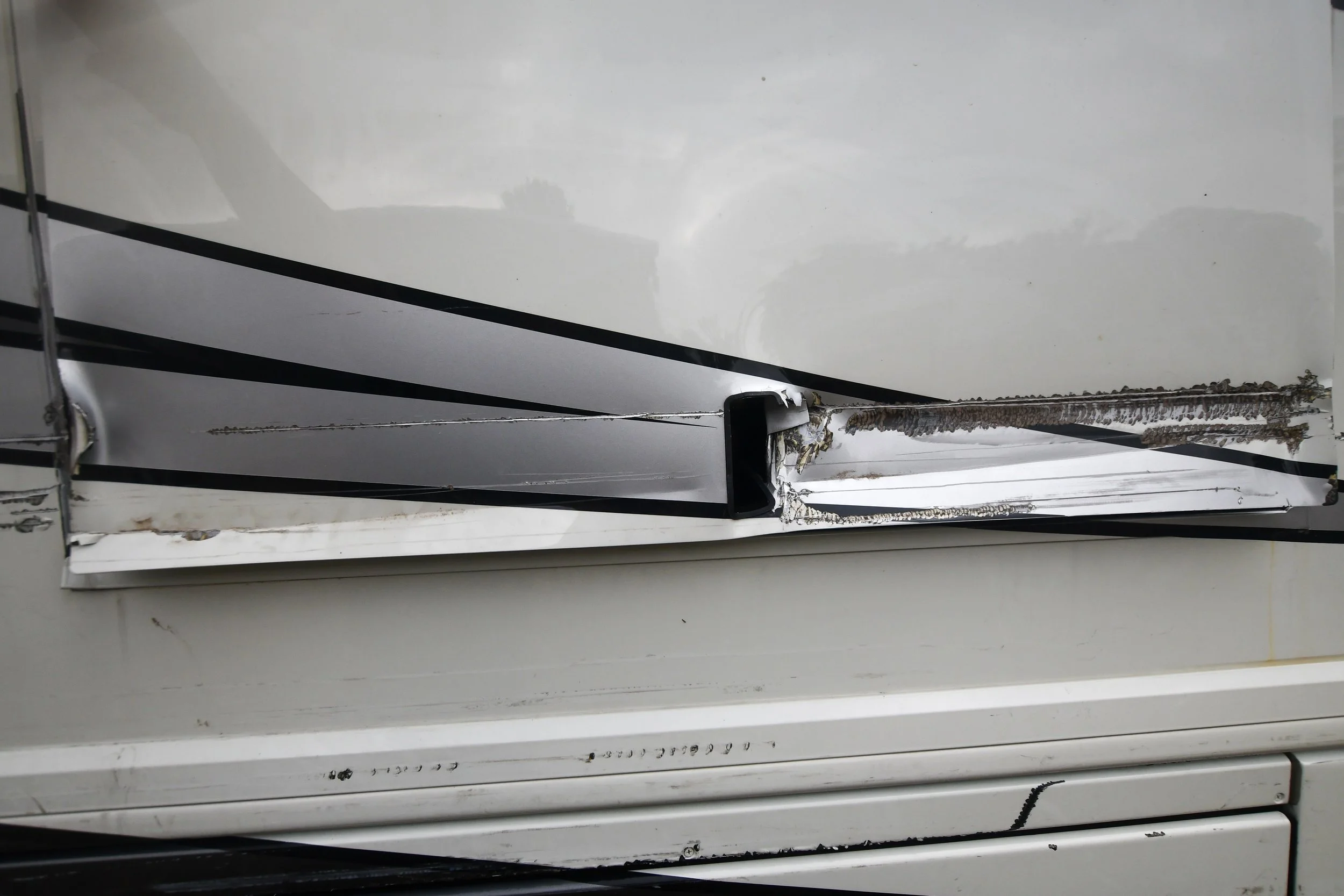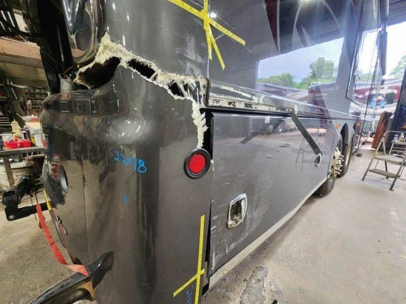 Before and after for Motorhome repair. damage to the rear passenger side. Damage to tail light, bay doors , and the rear passenger wall and slide.